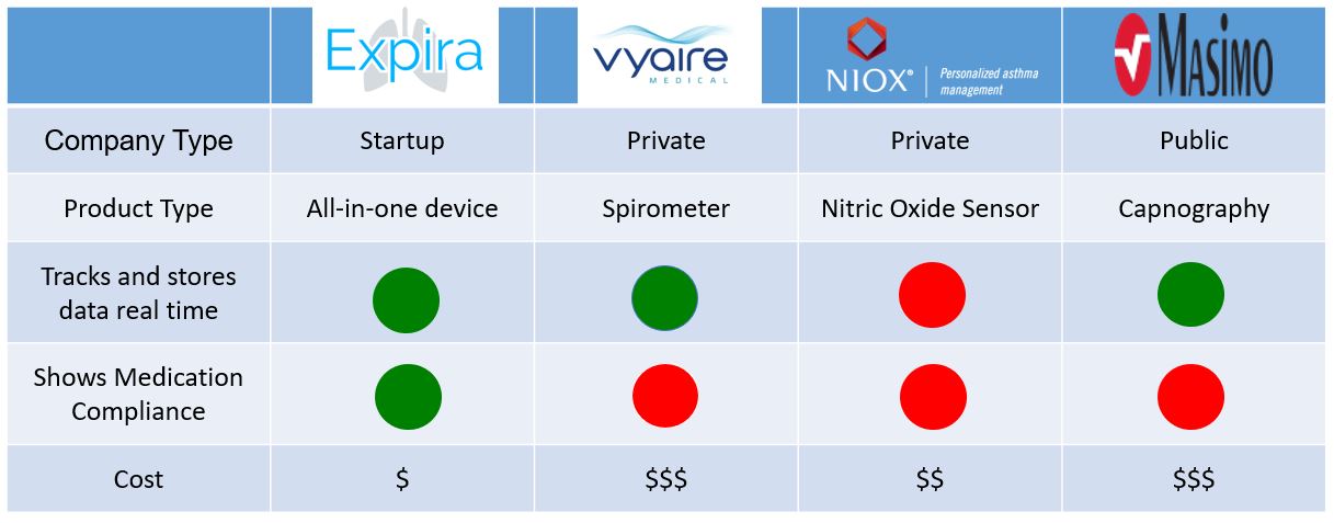 The device Expira propses is unique from the competitors as it can track and store data in real time while showing the medication compliance all in one device. Biotech companies like Masimo, Vyaire, Niox, can not provide both functions simultaneously. Expira's proposed device offers far more functionality for a cost lower than the competitor's asking price.
